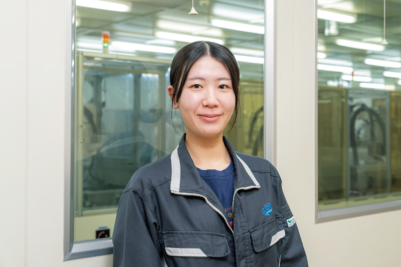 精密な電子部品を外部の影響から守るために封止した状態に異常がないかを検査する封止オペレーターの仕事をしています。コツコツと作業を重ね、ミスなく終わった時は達成感でいっぱいに。目標は複数の作業やラインを任されても、安定した品質とスピードを維持できるようにすること。3交代制勤務なので残業がなく、時間を有効に使うことができます。