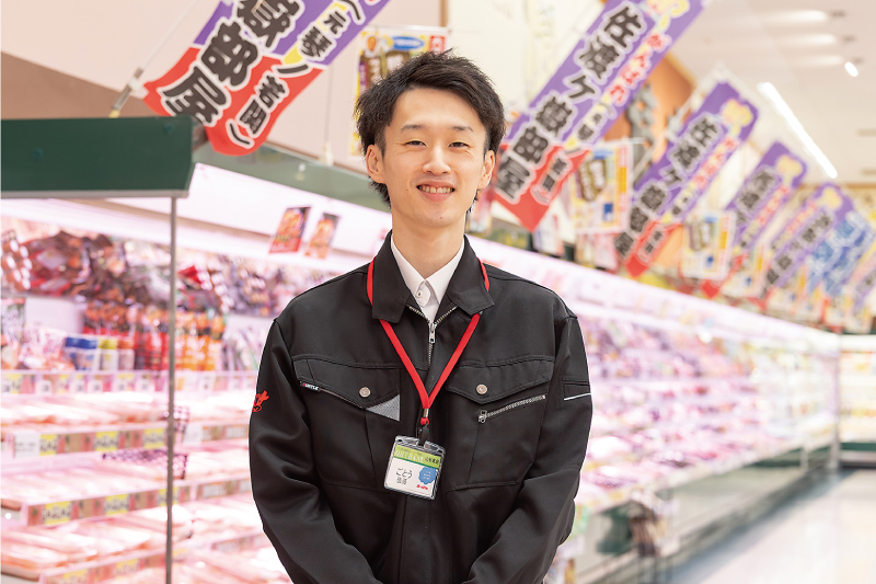 入社9年目、現在は山形東店で精肉主任を務めながら、食肉トレーナーとして仲間の育成にも取り組んでいます。若手社員やパート、アルバイト、海外からの実習生まで幅広く指導していますが、言葉や文化の違いで伝わりにくいこともあり、どうすれば分かりやすくなるか日々工夫しています。仕事のやりがいは、自分が考えた売り場や商品構成が、お客様の“買いたい気持ち” とうまく重なったときです。季節ごとの食卓や地域のイベントを意識しながら売場づくりを工夫することで、目標を達成できた瞬間は特に嬉しく感じます。3年目で主任になり、トレーナーも兼務していますが、努力を認めてもらえる職場なのでやりがいがあります。肉の知識は奥深く、まだまだ学ぶことは多いですが、これからも商品知識とトレーナーとしてのスキルを磨き、お客様に喜ばれる売場づくりを続けていきたいです。