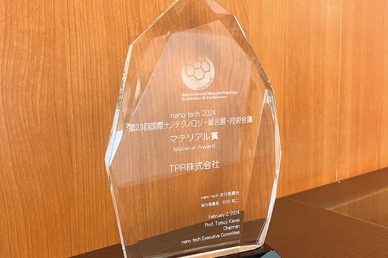 TPR(株)では新規事業開発の一環として、カーボンナノチューブ(以降CNT)やナノポーラス材料のなどの研究開発を行うと共に、様々な展示会にてPR活動を行い、『nano tech 2024』にて『マテリアル賞』を受賞しました