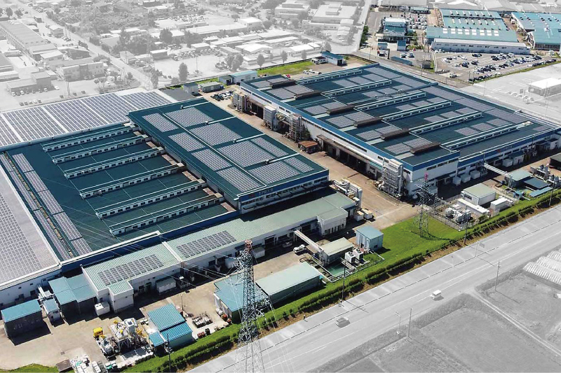 全景写真。工場屋根には2.2メガワット(約6,500枚)の太陽光発電パネルを設置し、SDGsへも貢献。