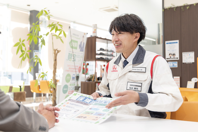 『ホンダカーズ山形』は、わからないことがあれば誰にでも気軽に聞ける風通しのいい職場環境。この会社のいいところは、店舗で目標を達成するために、互いに協力してフォローし合うチームワークを大切にしていることです。「自分が別件を抱えていて担当のお客様に対応できなかったりする場合も、担当に関係なく部門を超えた連携をとれる。職場環境としては、すごく仕事がやりやすいですね。お客さまとの信頼関係を深めていくことが営業活動につながっていく点が当社の営業のよさであり、仕事のやりがいや醍醐味だと思います。納車の時に感謝の言葉をいただいたり、『次に家族のクルマを買うときもホンダ車にしたい』と言ってもらえたりすると、うれしいですね」。