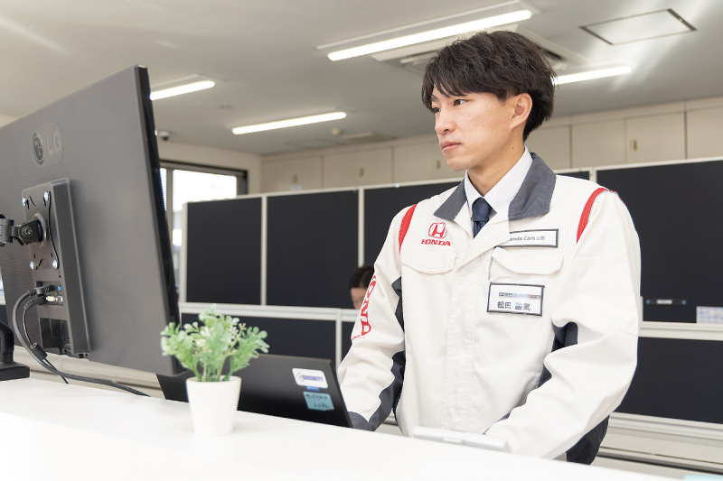サービスフロントは来店したお客さまに最初の対応をするスタッフで、店の顔ともいえる存在です。自動車の購入を目的に訪れる方だけでなく、定期点検や車検、故障といったトラブルなど、さまざまなニーズにすみやかに対応できるよう、クルマの整備や販売に関する豊富な知識が必要です。「定期点検や車検、故障といったトラブル対応など、購入後も安全で快適なカーライフを楽しんでいただけるよう、お客さまに寄り添う気持ちが求められる仕事です。サービスフロントを担うようになって、整備士の専門知識も、営業としての経験も、どちらも生かせていると日々感じますね」と松田さん。