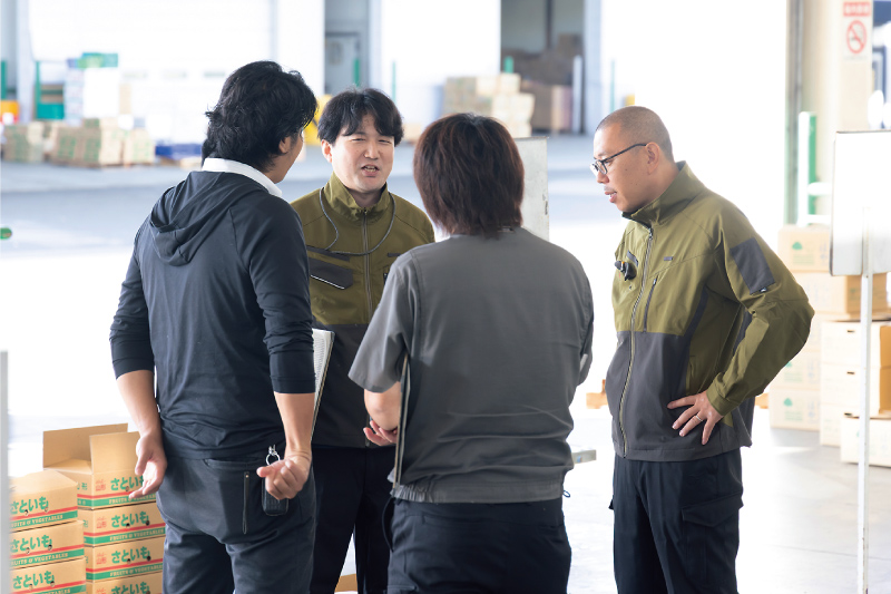 丸勘には、年間を通し生産者やバイヤーなど全国各地から多くの来客があります。「社員が生き生きとしていて、明るい雰囲気の会社という声を多くいただきます」と、総務部の佐藤玲於奈さん。求めるのは、素直に人の話を聞くことができ、「感謝力」がある人。加えてコミュニケーション能力が高く、元気で明るい人。さらに、「嫌なことがあっても自分の将来の糧になるとプラスに考え、ひたむきに努力できる人と仕事がしたい」と続けます。天候に左右され、日々変動する市場の仕事は正確さと迅速な対応が求められるため、部署間の連携は重要なポイント。たくさんの人と関わる市場では必要とされる資質です。