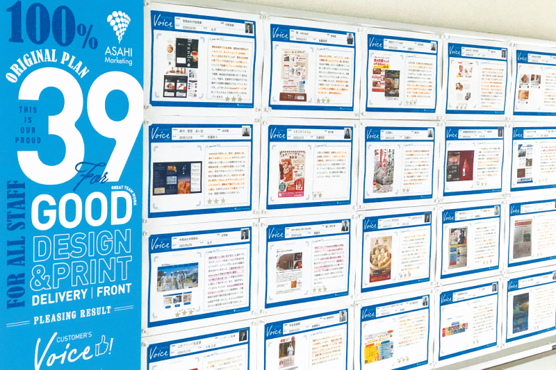 お客様から頂いた感謝の言葉や、具体的な効果などを社内に掲示。毎月たくさんのありがとうが集まります。