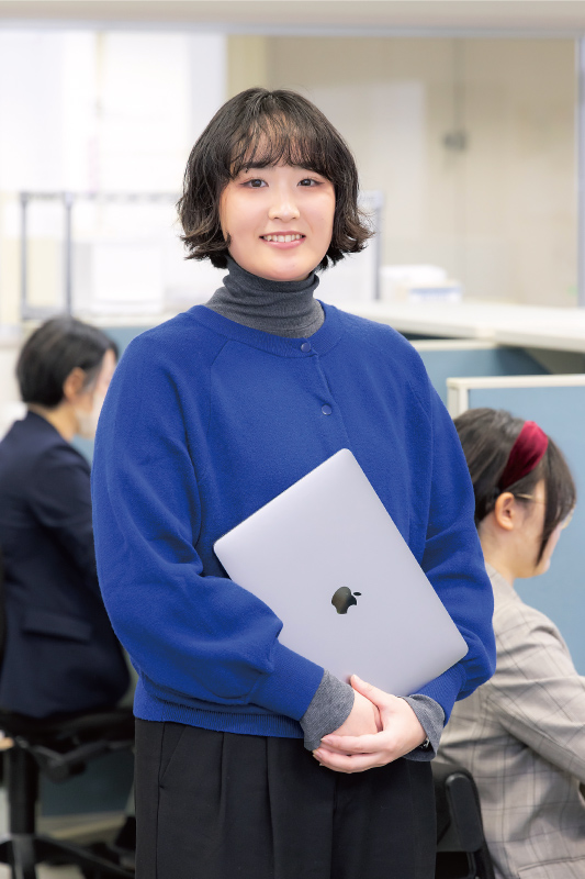 アウトや進め方に苦戦したのを覚えています」。先輩たちに教えてもらいながら完成させたHPは、お客さまから感謝の言葉をいただく結果に。「喜んでもらえて本当にうれしかったです」。そうした一つひとつの達成感がやりがいにつながっています。わからないことがあっても相談しやすい社員同士の距離感も当社の良いところ。「自分の未熟さを実感しながらも、好きなことを仕事にできている喜びが大きいです。これからも先輩方の背中を見て多くのことを学んでいきたい」と穏やかに話す姿に、頼もしささえ感じます。