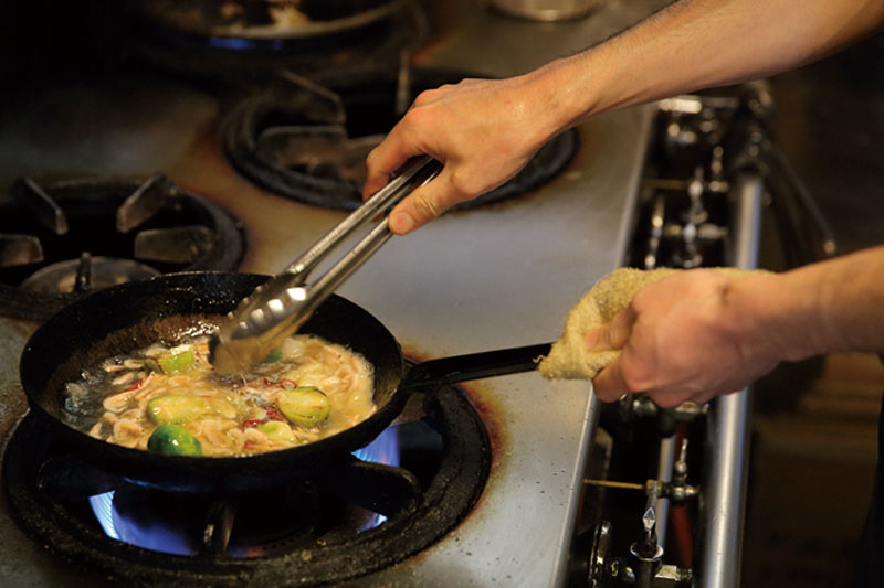 かわいらしい小物があちこちに飾られた、古民家のようなカフェ。週替わりのランチメニューでは、カレーやスパゲティなど3種類のメインから選べ、副菜2品とドリンクが付いて人気です(880円〜)。全てのメニューに生パスタが使われ、モチモチ食感のパスタを求めて女性のお客さんが集まります。とくにおすすめは、季節だけの数量限定品。オイルソースをベースにしたパスタは、桜エビと芽キャベツがふんだんに入り、春の息吹を感じられます。ニンニクの香ばしい香りが広がり、ほろ苦い芽キャベツを口にすれば、素材の旨みに目を見張るはず。