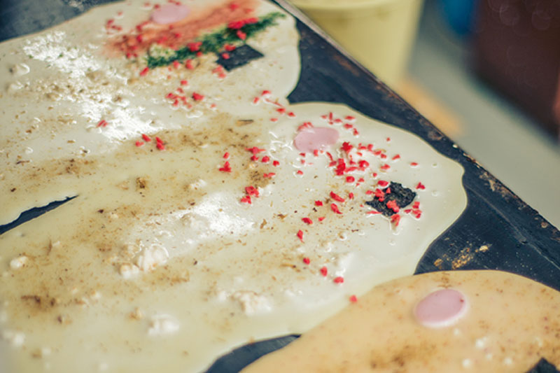 ソースか醤油の二択だった頃、ピザ風どんどん焼きを考案して一大センセーションを巻き起こした、変わりどんどん焼きのいわば先駆け的存在が「いわい」。現在提供しているのは定番のほか、ピザ、明太チーズ、ビビンバなど6種類です。そして、1本の大きさがとにかくデカいっ! ボリュームに臆することなく、ひとりで2本食べちゃう方も意外に多いとか。「やっぱり熱いうちが一番うまい!」という方にうれしいイートインスペースもあり。あつあつをガブっ、ハフハフっとどうぞ。