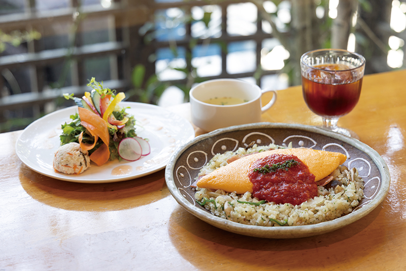 ソースからスイーツのホイップクリームまで、化学調味料や保存料は使わずにすべて手づくり。野菜は自家農園で無農薬栽培したものや産直から仕入れた地物を、卵は半澤鶏卵のブランド卵を使用しています。さらに、白米は美容効果の高い紅花の煮汁で炊いているというから驚きです。