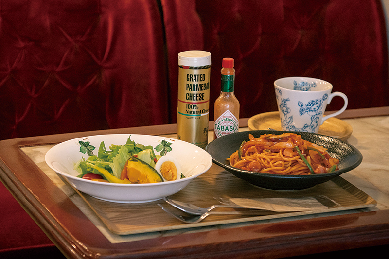 具はウインナーに玉ねぎ、ケチャップ、隠し味にバターを効かせたナポリタン。たっぷりのサラダ、コーヒー付きで1,000円。