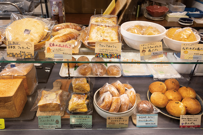 薬師町・藤田製あん所の粒あんを使用した「あんぱん」(250円)、ネギが練り込まれた「野菜フォカッチャ」(180 円)、バターが香る「ハニートースト」(250円)。