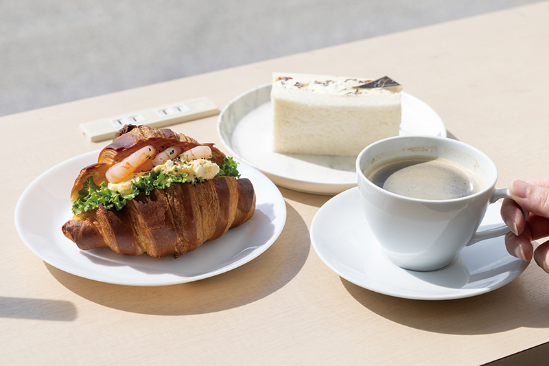 「エビとたまごのクロワッサンサンド」(432円)と、秋の新作「ラムレーズンサンド」(248円)。ブレンド(350円)と一緒に味わって。