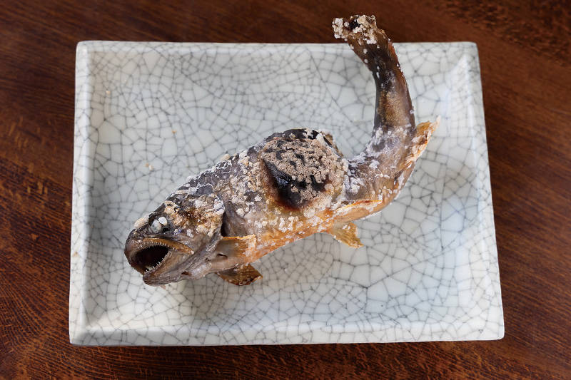 岩魚の塩焼き(1匹700円)は、上品で淡白な味わい。水槽から出してすぐに炭火で焼いてくれるので、新鮮で川魚特有の臭みがありません。