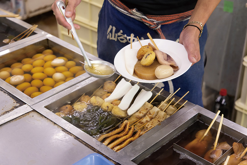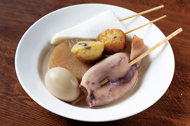 おでん 各種(100円〜)。名物のおでんの具は10種類以上。どれも味が染みていておいしく、心身ともにほかほかに。鍋持参でのテイクアウトも可能です。