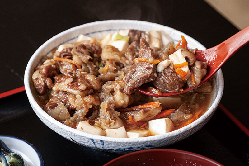 牛すじ煮込み定食(950円)。鈴木さんの代で加わった人気メニュー。とろとろの牛すじは旨みと甘みたっぷり! 脂を丁寧に除くことで、濃厚ながらも上品な味わいに。