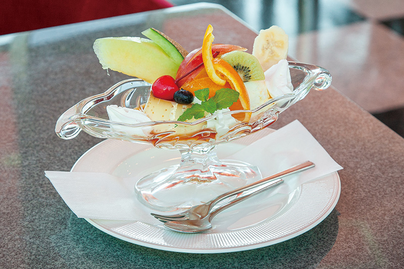 固めに仕立てたプリンが主役、みずみずしいフルーツをあしらった自家製プリン・アラモード(850円)はパーラーの人気メニュー。