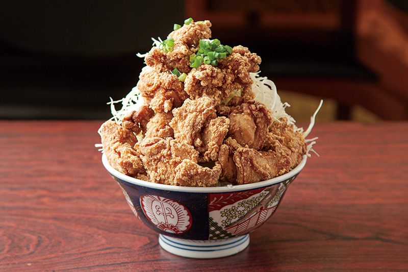 超爆盛!! 唐揚げ丼(1,500円)。料理長特製、大ぶりのジューシーな唐揚げが10個! キャベツの千切り、ごはんも山盛りで圧巻のボリューム。家族でシェアしても。