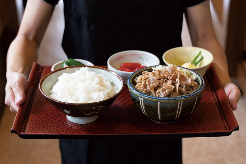 ごはん物から麺類までバリエーション豊富で、「何を食べてもハズレがない」と常連客でにぎわう地元の食堂。メニューの中でも50年前の創業時から変わらず人気なのが、牛煮込み定食です。当時は手に入りやすかった牛ほほ肉を使い、芋煮味の煮込みに仕上げて提供したことがはじまり。