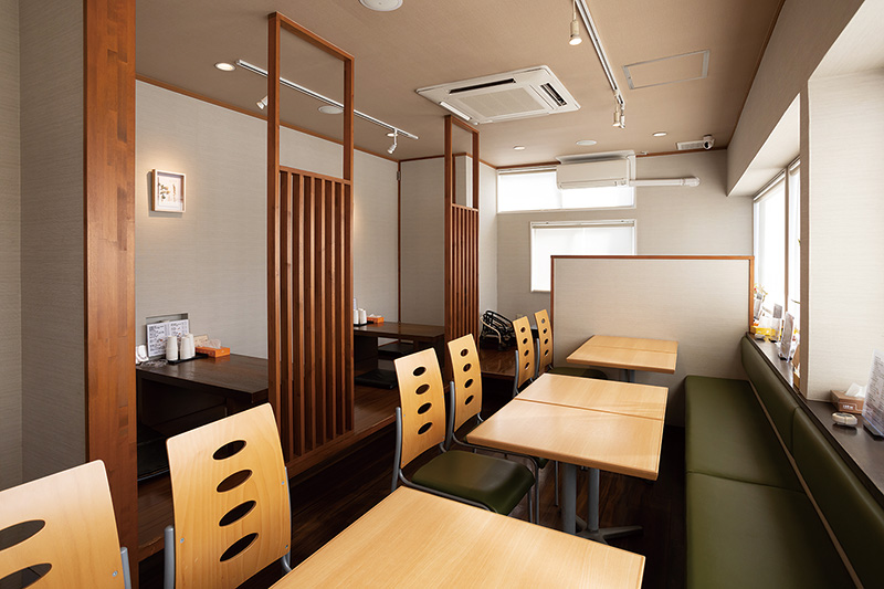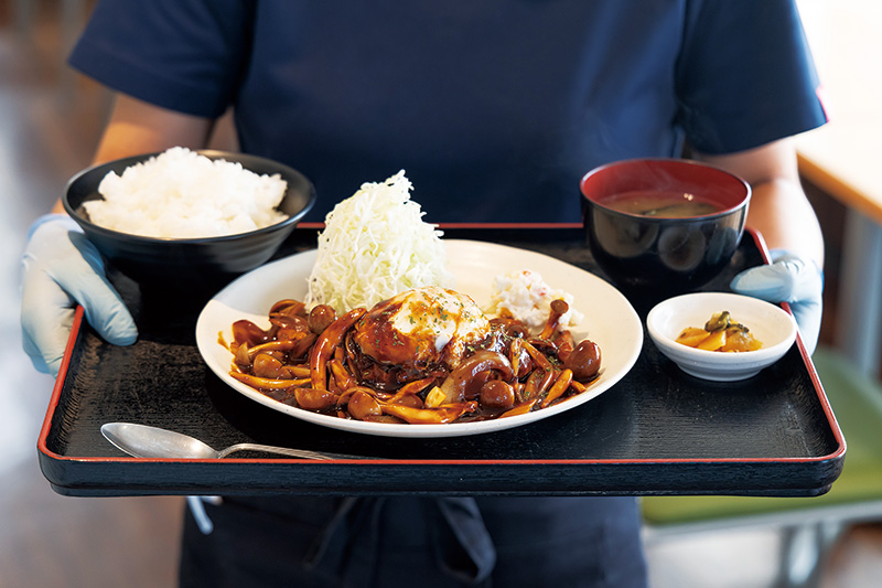 子どもから大人まで満足できる手づくりにこだわったメニューと、気軽に入れる雰囲気が人気の定食屋さん。評判の唐揚げはもちろんのこと、煮込みハンバーグ定食もテッパンのおいしさです。ハンバーグだねの挽き肉は、国産の牛肉と豚肉を同じ量で二度挽きすることにより、なめらかでふっくらとした食感に。
