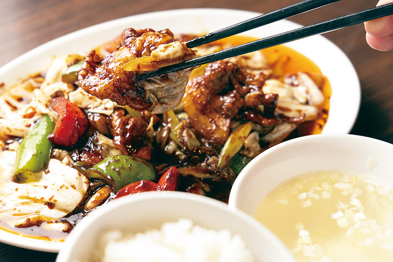 厚切りの豚肉とキャベツ、ピーマンなどを強火で一気にオリジナルの甜麺醤で炒めました。甜麺醤は1〜2時間かけて煮詰め、世代を問わず楽しめる味にしています。高校生が数人で、ライスと一緒に頼んでシェアして食べていることもあるそう。ランチやディナーから、飲みのシメまで幅広く愛されています。