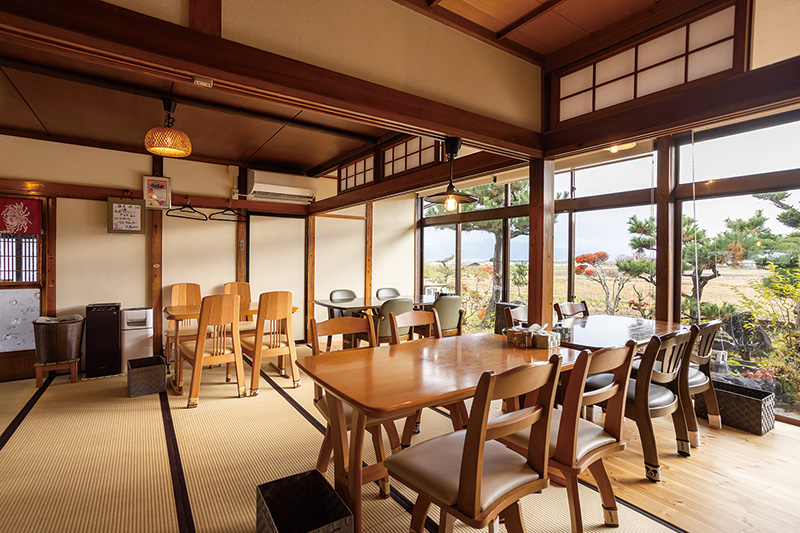 定番メニューは「やまがた地鶏醤油ら〜めん」一本で、大江町産「やまがた地鶏」を煮込むスープがおいしさの決め手です。5時間かけて丁寧に火を入れるため一切臭みがなく、鶏と醤油だけとは思えない奥深さが後を引く一杯。全粒粉を使った細ストレート麺は喉ごしがよく、低温調理で仕上げた鶏チャーシューは身のしっとり感と味わい深さが秀逸です。食後に店主の母・信子さんの手づくりレアチーズケーキも人気。景色を楽しみながら、ひと息和める古民家ら〜めんカフェです。