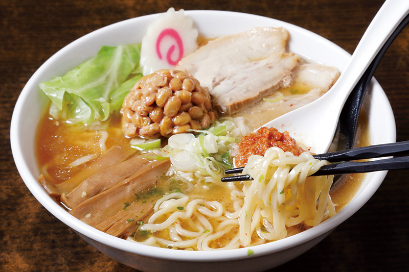 ラーメンと並んで、山形の人は納豆が大好き。数種類の味噌を合わせた特製味噌だれを使ったスープに辛味噌、チャーシュー、メンマ、なると、キャベツ。さらに納豆をトッピングした辛味噌納豆ラーメンは、季節を問わず一番人気です。麺は若干の縮れを加えた中太の自家製麺。多加水で1〜2日の熟成を加えており、もちもち、つるつるとした食感を楽しめます。辛味噌を溶かすと納豆の風味も相まって、スープがさらにコクを増してぐっと奥行きのあるおいしさに。穴あきレンゲが添えてあるため、底に沈んだ納豆もすくって最後までいただけます。
