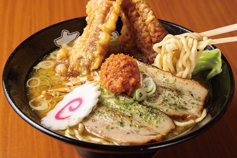 げそ天が丼の上にそびえ立つ名物ラーメンです。魚介ベースのスープ、数十種類の素材を合わせた辛くてコクのある辛味噌、とろとろのチャーシューなど、一つひとつにこだわりが詰まっています。自家製麺は、北海道産の小麦粉3種類をブレンド。さらに、北海道産の全粒粉も使用し、香り豊かでモチモチとした麺に。小麦の味を堪能できる太麺やオーソドックスな中太麺、スープをより味わえる細麺など3種類から選べます。辛味噌は別皿にすることも可能です。大きなげそ天が食べにくいという方は、細かくカットして別皿で提供してもらうこともできます。