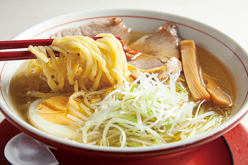 あるます〜ぷの塩が食べたい」というお客さんの要望から生まれた一杯。国内産の塩を用い、鶏ガラや昆布、野菜を煮込んで丁寧にとって美しく透き通ったスープは、澄んだなかにも突き抜ける旨みと深みを秘めています。麺は喉ごしと口当たりのよい、もっちりとした特注の中太縮れ麺。大ぶりで食べごたえのあるメンマ、国産の刻み柚子がさわやかなアクセントに。高畠ワイナリーの赤ワインと、その赤ワインを使った自家製のワイン塩で仕込んだ豚肩肉のチャーシューがまた絶品。塩ラーメンだからこそ引き立つ、肉の味わいをぜひ堪能して。