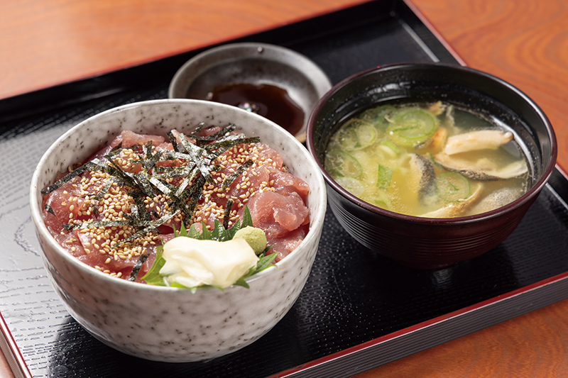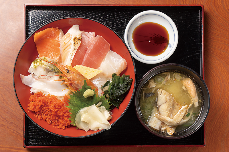 市場で働く人はもちろん、家族連れや一人客、高齢のご夫婦、夜勤明けに立ち寄る人など、幅広い層が足を運びます。市場の食堂ならではの早朝営業で、午前中は比較的落ち着いた雰囲気。人気を集める中落丼をはじめ、まぐろやサーモン、白身魚が彩る「いちば丼」など、その日の仕入れによる鮮魚を使った丼が並びます。素材のよさが光る海の幸を、朝から贅沢に味わってみて。