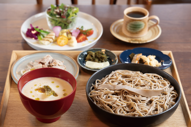粉は最上早生、仕込みにはミネラル豊富な葉山から汲んできた清水を使用。さらに化学調味料は加えず、砂糖は粗糖や甜菜糖を使い分けて。今回紹介するのは、春の訪れを告げる期間限定メニュー。泡状のそばつゆは二番だしと豆乳がベース。口に含むと、ふきのとうの香りがふわりと広がります。野菜は地元産、卵は平飼いのものを。フレンチの道で経験を積んだ店主がつくる料理は、ココロにもカラダにもやさしい味わいです。