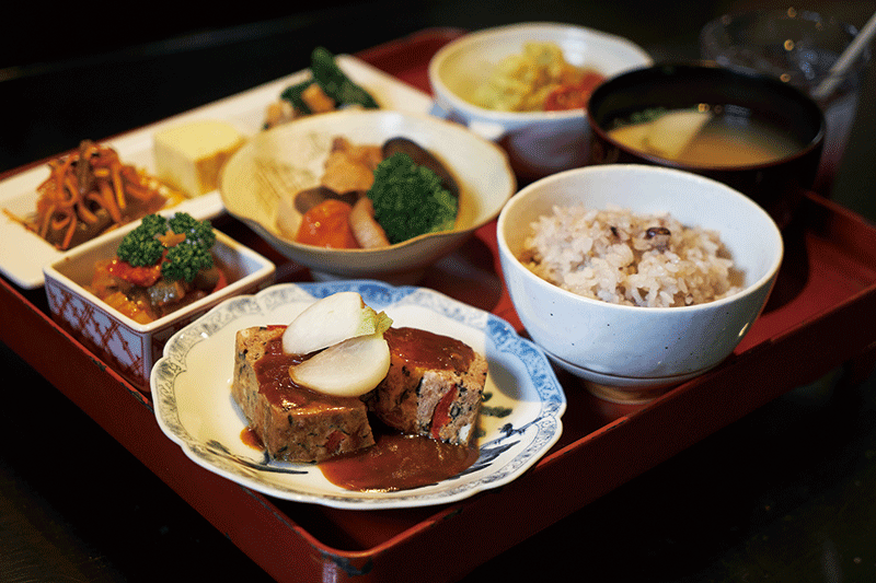 太い柱、古い建材を使った天井が歴史を感じさせる「灯蔵オビハチ」。山形市内に残る蔵をリノベーションし、ライブ会場&カフェとして蘇りました。蔵に眠っていた朱塗りのお膳に合わせて考えられたのが、このランチ膳。季節の野菜やコンニャク、オカラなど、多品種の食材を少しずつ使い、ごはんは雑穀米に。1食で30品目近くが摂取できます。