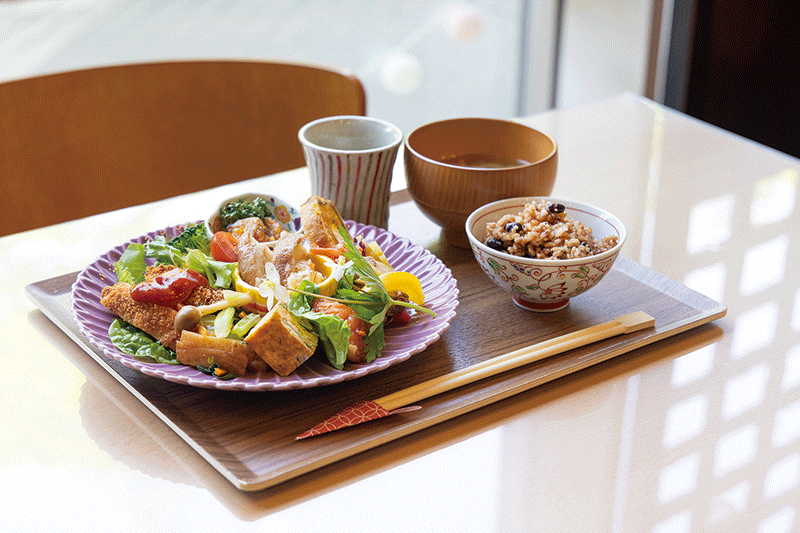 料理研究家の鈴木沙織さんが家族で営むカフェ。自家栽培の野菜や県産食材を用い、添加物を使わずに、素材の持ち味を生かしたグルテンフリーの「季節のつなぐ膳」を提供しています。献立は毎月変えており、何度訪れても飽きさせないように工夫。栄養素も偏らずにバランスよく食べられるように配慮されています。旬の食材を取り入れた、体にやさしい味わいが楽しめます。