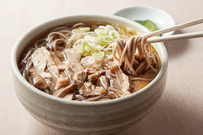 店名の由来は、バスの待合所近くに店があり、「ちょっと一杯」の店だったため。「肉そばが冷たいのは、上にのった鶏肉を肴に酒を飲み、その後でそばを食べたから」と代表の吉田繁生さん。そばはつるりとした食感で、配合は小麦粉が多め。昔ながらの親鳥のスープにこだわっています。繁忙期には県外からの客が多く、1日500~600杯を提供することも。
