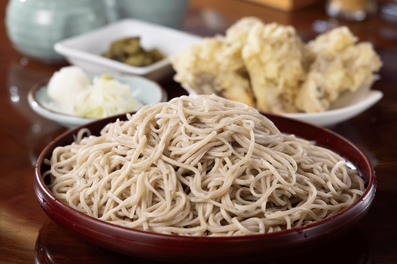 山形県産の「でわかおり」を使用した細打ちそばを、鰹節や宗田節で丁寧にだしをとったキレのあるつゆで味わえます。香り豊かなサクサク食感の舞茸の天ぷらが付いたセットも根強い人気。そばの配合は季節によって変わり、暖かい時期は二八そばに仕上げています。4月上旬からは、「寒ざらしそば」がスタート。この時期だけのおいしさを楽しんで。