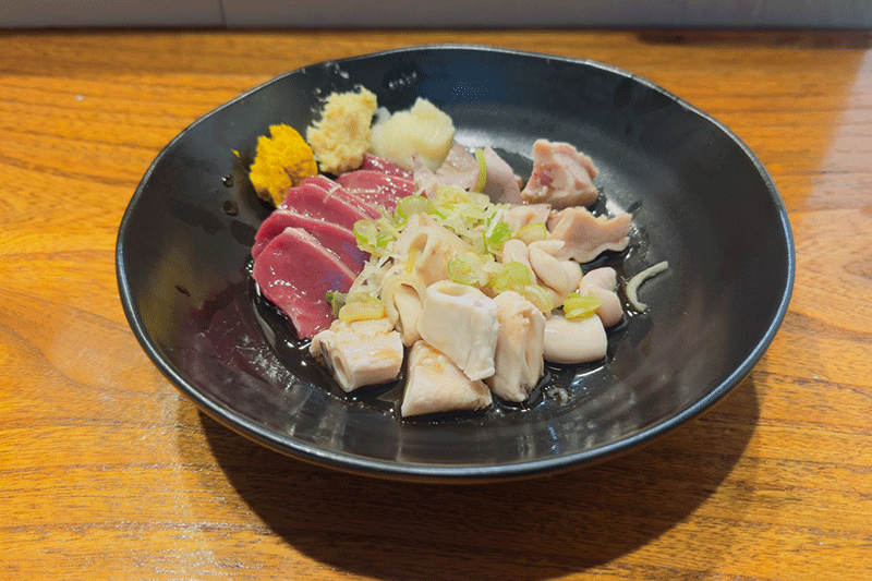 おすすめは、ガツ、こぶくろ、ハツのホルモン三点盛り(キモグチを加えた四点盛りもあります)。辛子、生姜、ニンニクと一緒に混ぜていただく味は、唯一無二のおいしさ。ヤミツキ必至の一品です。さらに、肉厚の石焼きレバーもお酒との相性はバツグン。カウンター8席のみなので、予約は必須。