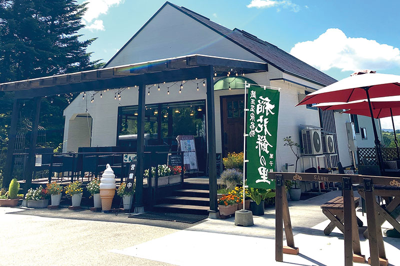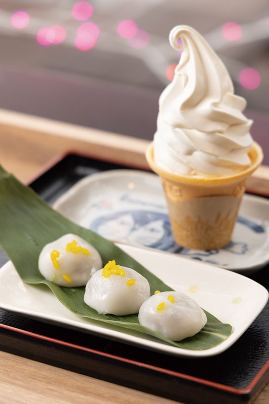 お土産に大人気の「いがもち」は、一つひとつ手づくり。店内では、その「いがもち」をコーヒーや抹茶とのセットで楽しむことができます。これからの季節は、予想以上に濃厚なソフトクリームとのセットがおすすめ。店内はワンちゃんOKです。