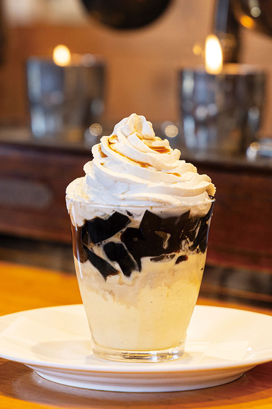 サイフォンで丁寧に淹れた濃厚なコクと香りを、贅沢にゼリーに閉じ込めました。ひんやり冷たいバニラアイスと生クリーム、仕上げに注ぐカルアソースが織りなす三重奏はちょっぴり大人の味に。食後の余韻を深める、至福のデザートをどうぞ。