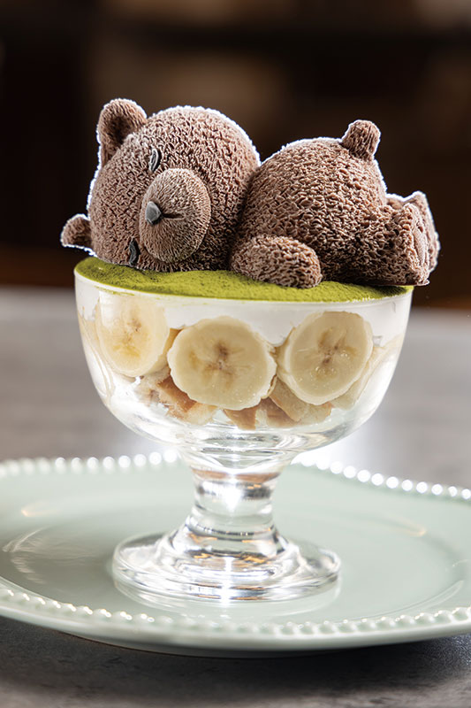 抹茶の芝生でまどろむのは、毛並みまで繊細なチョコレートムースのクマ。その下には、やさしい甘さの生クリームと完熟バナナ、シャキシャキのリンゴが隠れ、サクサクのワッフルとビスケットが食感のアクセント。ほっこり癒される、甘いひとときを。