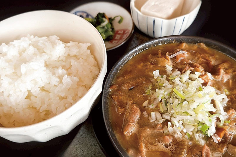 朝からグツグツ煮込み続ける「もつ味噌煮込み」は、やわらかくてごはんにピッタリ!「もつ味噌煮込み定食は、すぐ提供できます!」と、ご主人。飯塚の人気店「赤身焼肉しん」系列の定食屋とあって、国産豚もつを100%使用するこだわり。メニューは他に「冷たい肉そば」「もりそば」など。