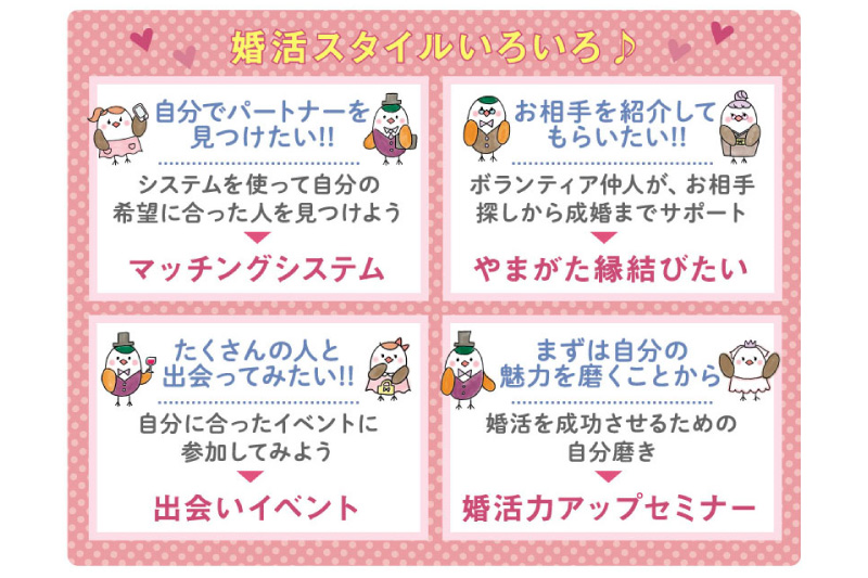自分好みのお相手を検索できるマッチングシステム、ボランティア仲人さんによる紹介、各地で開催されている出会いイベントなど、様々な婚活スタイルがあって、可能性が広がりますね。これを機会にまずは一歩、踏み出してみようと思いました!
