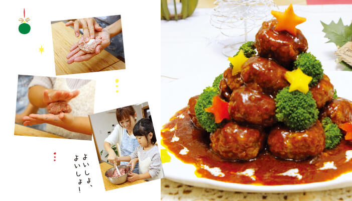 ⑤ ハンバーグをツリーのように重ねて並べ、隙間に茹でたブロッコリーを差し込むようにして飾る。星型に型抜きして茹でた人参と、星型に型抜きしたパプリカも飾る。 “