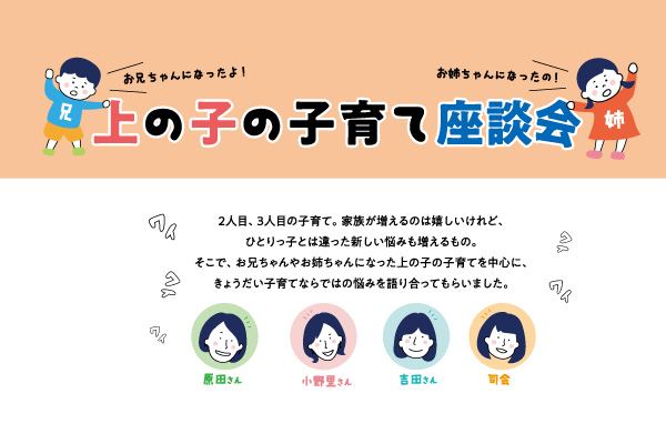 司会 まずは、簡単な自己紹介からお願いします。 原田 ちょっぴり甘えん坊な年中の男の子と、12月に1歳になったばかりの男の子がいます。弟は歩き始めるのが早かったので、毎日、目が離せないです。 吉田 わが家は年子で、5歳の男の子と3歳の女の子、それから下に2歳の男の子がいます。最近3人で仲よく過ごしてくれますが、それぞれに個性があるので色々と大変です。 小野里 どちらかというとクールなタイプの5歳の男の子と、7カ月の女の子がいます。お兄ちゃんは妹が大好きなので、よく面倒をみてもらっています。 |