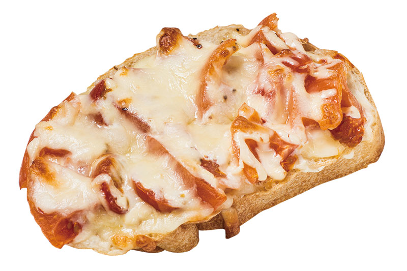 これは美味 たっぷりのトマトとチーズをフランスパンの生地にのせて焼き上げた、食欲をそそるパン。ワインにもビールにも合いそう。 |