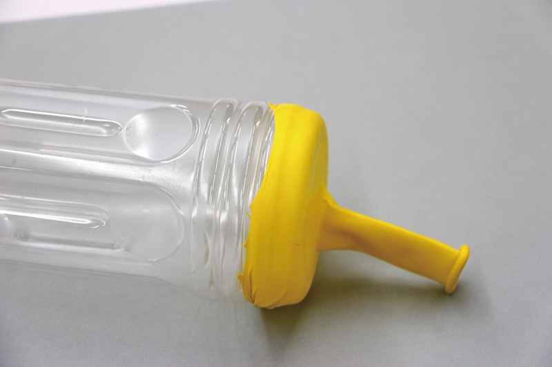 2風船の先をハサミで切り落とし、ペットボトルの底にかぶせ、ビニールテープで留める。 |