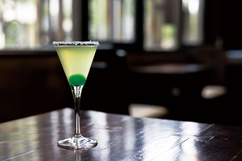 | 「雪国」(900円)。グラスの中のミントチェリーと、ふちに飾られた砂糖が輝く美しいカクテル。 | 昔から変わらぬ熱風式の焙煎機で自家焙煎。扉を開けた瞬間、コーヒーの香りが広がります。 |