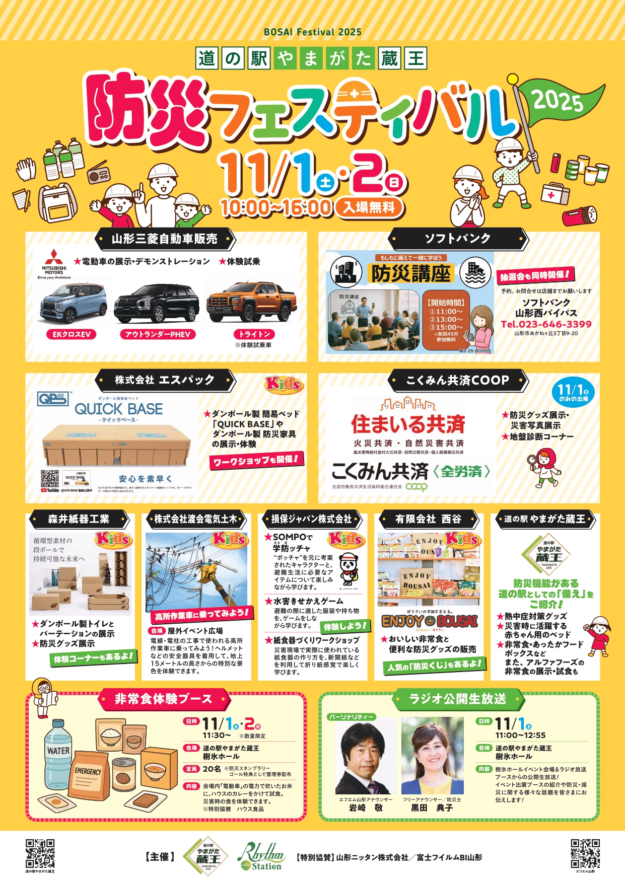 「道の駅やまがた蔵王」は、山形市の防災拠点として災害時には、一 時避難場所として市民の安全を守り、自衛隊や消防、警察などの活動拠点となる機能を備えています。そんな道の駅やまがた蔵王を会場に県内外の「防災・減災」に取り組む企業が集結!
