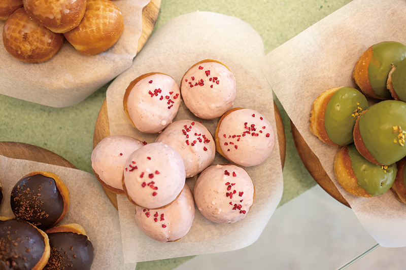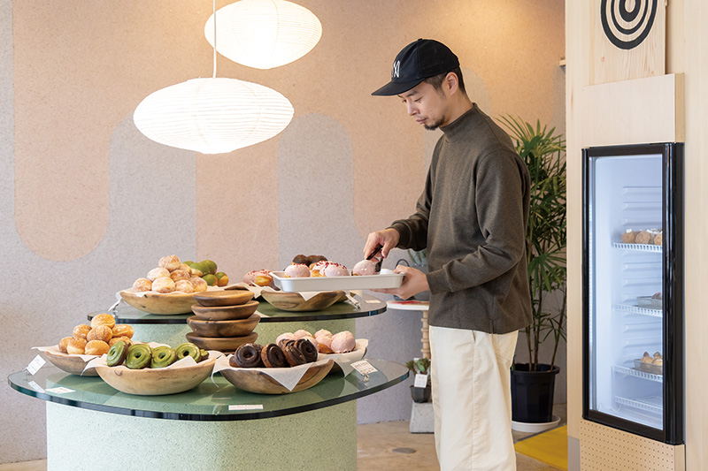 そうした思いを共有するメンバーが集まって立ち上げたドーナツ屋さん。中央に置かれた大きなテーブルには、10種類もの商品がセンスよくディスプレイされています。すべて〝できたて〟にこだわり、食感の違う3種類の生地をベースにアレンジ。北海道産小麦、大豆バターを用いたやさしい味わいが人気で、あっという間に売り切れてしまうほど。店先には、誰もが立ち寄って休憩できるスペースも。ドーナツを頬張りながら、まったりとした時間を。