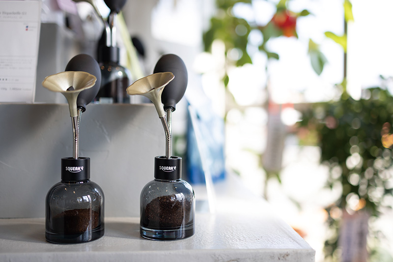 ブルーの壁とアンティーク家具が調和するスタイリッシュな空間で、2階は10歳未満の入室を控える大人のスペース。1階には小上がり席もあり、親子でもゆっくり過ごせます。店内は香り高いコーヒーと自家製スイーツを中心に、会計後に席で味わうセルフスタイルを採用。テイクアウトも可能で、焼き菓子や紅茶はギフトとしても人気です。コーヒー豆も販売しており、アロマディスプレイで香りを確かめながら好みの豆と出会えるのも楽しみ。