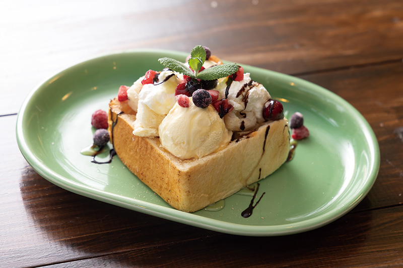 スウェーデン中部のダーラナ地方をイメージ。厚切りパンにアイスやフルーツを盛り付けたボリューミーなトーストデザート。