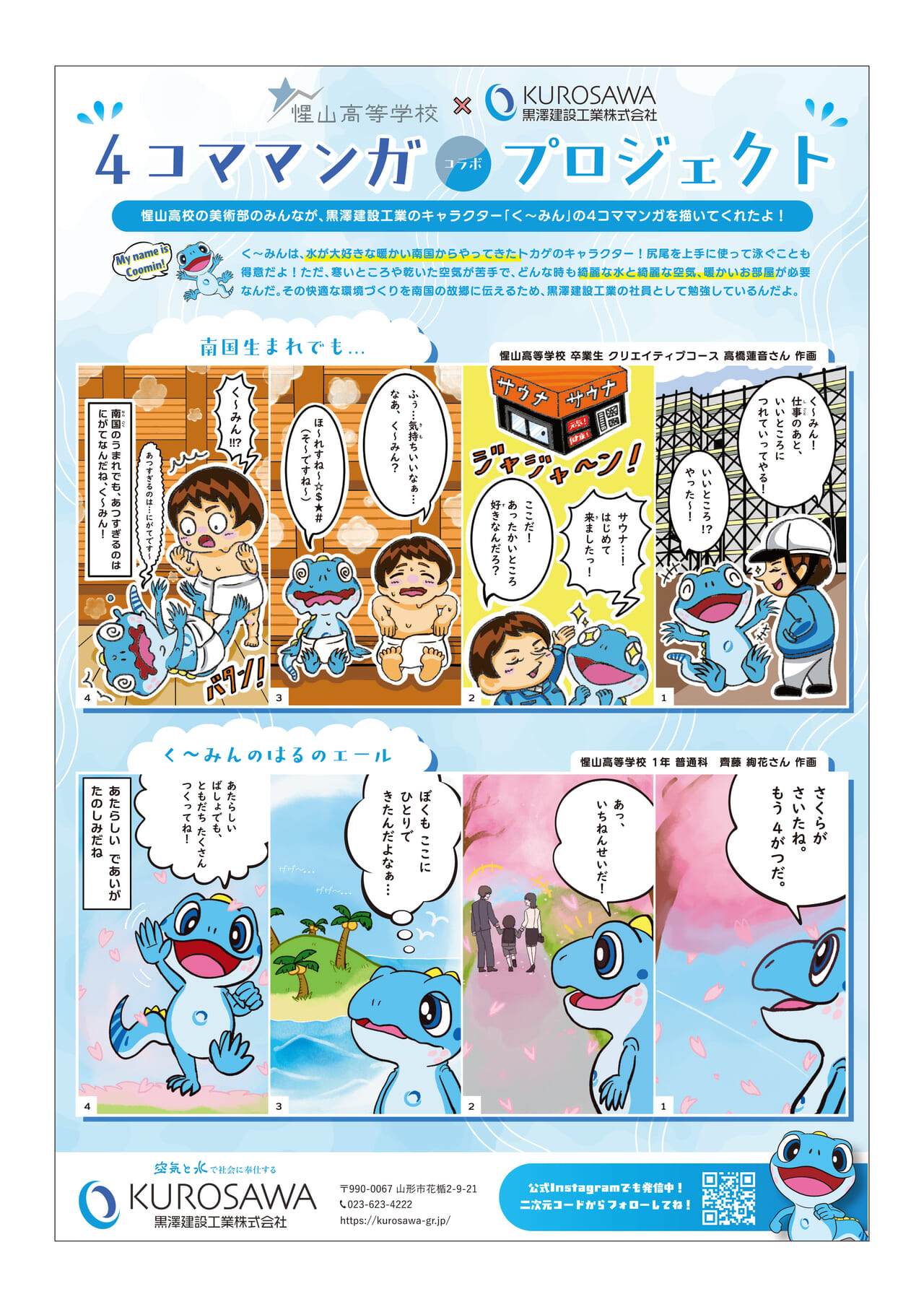 情報誌「マーメイド」では、惺山高等学校 美術部と黒澤建設工業株式会社による共同プロジェクトとして、企業キャラクター「く~みん」を主役にした四コマ漫画の連載をスタートします。