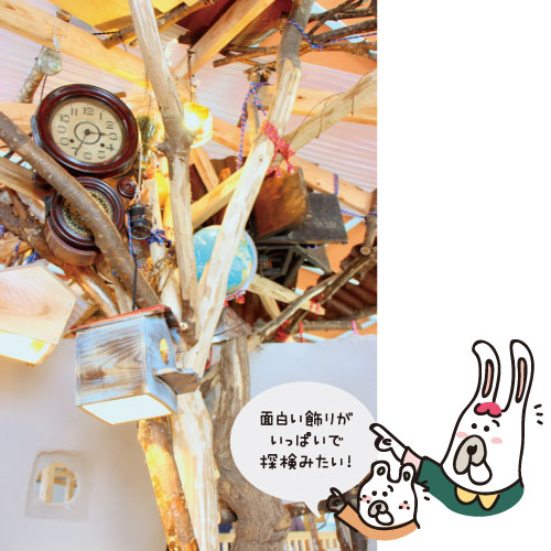 かまくらをイメージしてデザインされたツリーハウスは、2階建て。 廃材を使って製作し、海の浮きや古いバイクなど、個性豊かなオブジェがあちこちに飾られています。 |